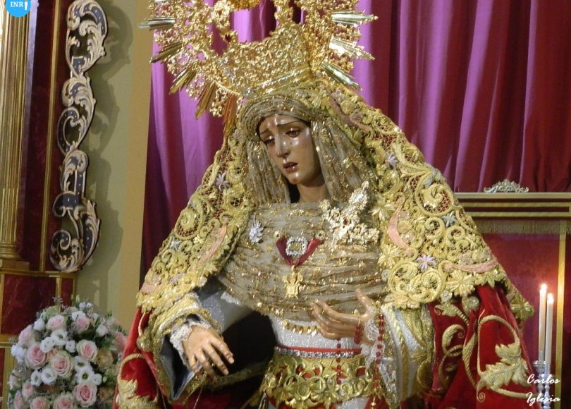 Virgen del Amor, Pino Montano: Situada en el Altar Mayor de la Parroquia de San Isidro Labrador, la Dolorosa de la Corporación del Viernes de Dolores, estuvo en solemne y devotos besamanos, que desde las primeras horas hubo un paso constante de hermanos, vecinos y devotos para besar la mano de la Señora y estar frente a Ella, y realizar sus oraciones de forma más intima y cercana. La Hermandad de La Exaltación cedió gentilmente un manto bordado de color rojo con las vistas bordadas para esta ocasión, saya lisa en tonalidad crema, cíngulo estilo «hebraico» y corona de salida; y escoltada con grandes centros de flores en tonalidades rosas y blancas a ambos lados de la imagen. Durante el besamanos, fue presentado el diseño de una nueva saya que estrenará en Viernes de Dolores venideros.