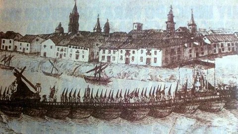 Antiguo puente de barcas con la cofradía de la O