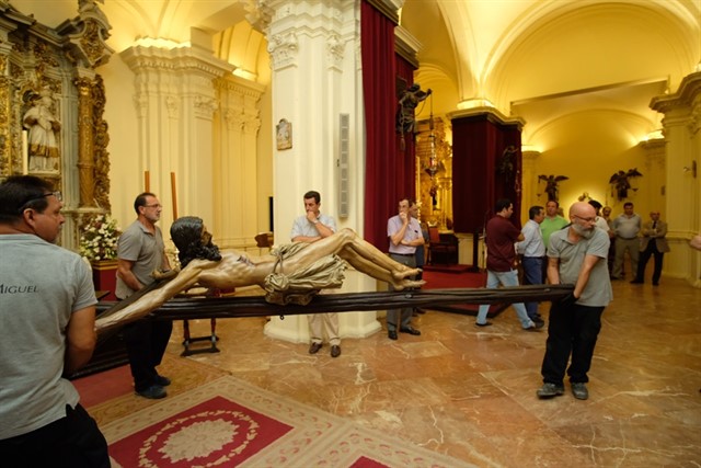 Asimismo, se realizará corrección del desencuentro en la unión de la mano izquierda a la cruz; protección de la película pictórica que presente riesgo de desprendimiento mediante papel japonés y cola orgánica; limpieza mecánica del polvo y depósitos superficiales de la imagen con brochas de pelo suave y aspirador; fijación puntual de la policromía; reintegración de lagunas de preparación con la misma composición a la del original; reintegración cromática no diferenciada de estas lagunas y desgaste de la línea de agua de ambos ojos, las cejas y el nacimiento del cabello en el contorno del rostro; así como la protección final mediante la utilización de resinas sintéticas estables y duraderas, ajustando el punto de brillo.