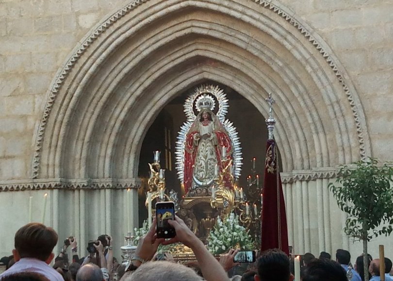 Y desde el Casco Antiguo a Triana. Madre de Dios del Rosario cruzó el dintel de la puerta de la real parroquia de Santa Ana pasada las 19.30 horas, donde estuvo acompañada por bastantes fieles durante todo el recorrido. La patrona de capataces y costaleros lució su manto de terciopelo rojo bordado en oro por el taller de Esperanza Elena Caro y saya azul bordada. Abría la comitiva la Banda de Cornetas y Tambores del Santísimo Cristo de las Tres Caídas y tras el paso la Banda de Música del Maestro Tejera.