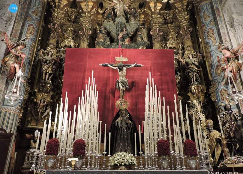 En uno de los laterales se encontraba el Señor de la Sagrada Entrada en Jerusalén, junto a Santiago Apóstol y San Pedro, mientras que delante de la mesa de altar se podía contemplar el pelícano del paso del crucificado. El conjunto lo completaba numerosas tandas de candelería de cera blanca, jarras con flores predominando el clavel rojo, y de fondo, una tela roja de damasco.