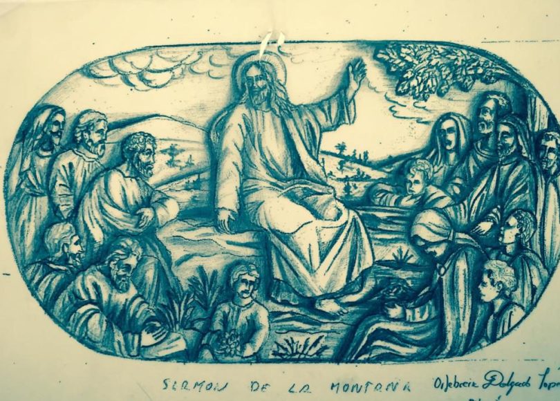 En la cartela delantera del canasto del paso aparecerá representada la escena del sermón de la montaña (Mt. 5, 5) mientras que en la trasera lo será la de “Los que quieren seguir a Jesús” (Lc. 9, 57-62), simbolizando que Jesús con su cruz nos va abriendo el camino y los devotos caminan tras la imagen.