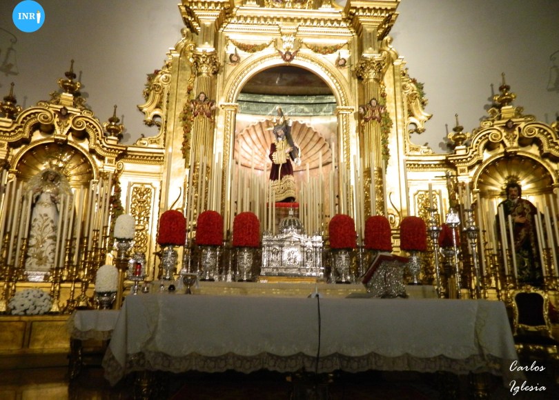 Varias tandas de candelería de cera blanca y jarras de flores compuestas de claveles rojos y blancos completan el montaje por parte del equipo de priostía. Además se presenta como novedad el recuperado paño de púlpito utilizado como frontal de altar para estos cultos.