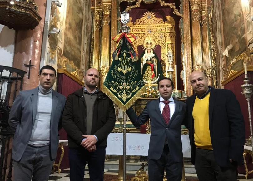 La Agrupación Musical de María Santísima del Rocío ha presentado y bendecido su nuevo banderín en la tarde del pasado lunes 11 de febrero.
