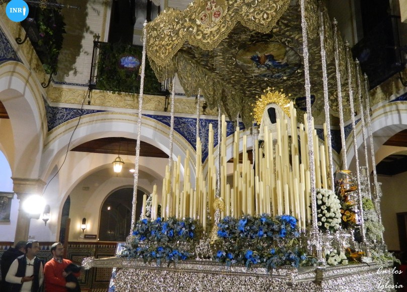 En el patio central se encuentra el paso de palio al completo de la Virgen de las Aguas del Museo, con su manto, saya y diadema de salida para la ocasión. En cada jarra se aprecia distintas variedades florales compuestas por el propio Grado.