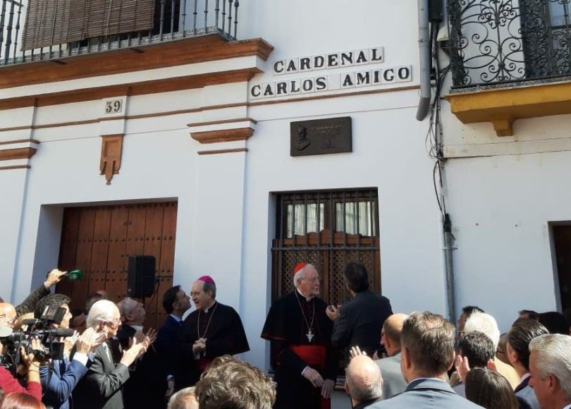 Este lunes 25 de marzo ha tenido lugar la presentación de la rotulación de la calle dedicada a Carlos Amigo Vallejo, a la altura del número 39. Numeroso público ha asistido a este evento, donde destaca la presencia, además del propio cardenal, el arzobispo Juan José Asenjo y el alcalde Juan Espadas.