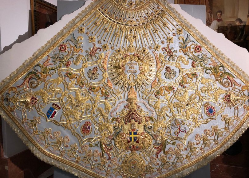 Ha sido realizada en oro fino sobre un soporte de tisú celeste, donde además se han incorporado más de 3.000 piedras semipreciosas.
