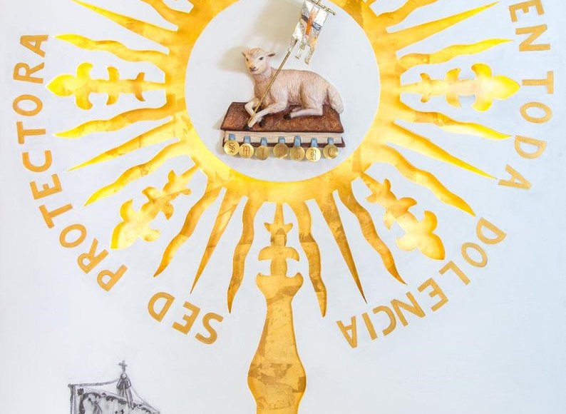 En la parte superior está la custodia puesta como un haz de luz reflejado en distintas láminas de oro que representa la fe y el amor de todos nosotros hacia Dios. El texto proviene de una canción popular de Villarrasa “nos dio en vos la providencia la más noble medicina, sed protectora divina, remedio en toda dolencia”, envuelve a todas las hermandades de gloria, gracias a María tenemos a la Eucaristía, al mejor remedio para nuestros males. El cordero es un alto relieve con un lábaro de orfebrería.