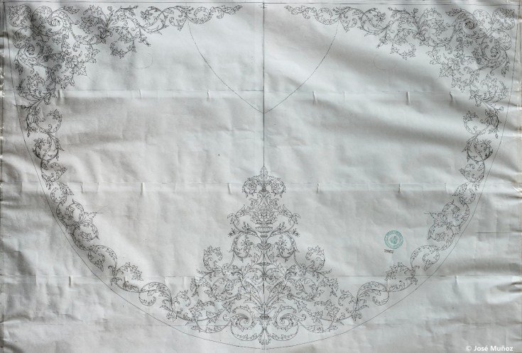 Esta pieza será bordada en hilo de oro y sedas de composición simétrica. Se constituye a partir de un eje central compuesto por un jarrón del que parten exuberantes rosas, motivos florales y ramas vegetales que dan forma al conjunto.