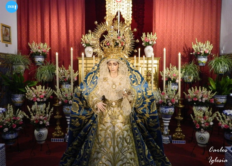 Tal y como si fuera un clásico patio sevillano, se podía contemplar alrededor de la imagen diversos jarrones y macetas de cerámicas de Triana, con distintos exornos florales, destacando los nardos. Además, a sus lados se podía ver dos fuentes de agua, representando el símbolo de su advocación.