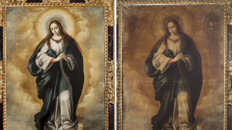 El estado de conservación de las piezas era muy deficiente. Por un lado, el soporte estaba muy debilitado, mientras que la incidencia micro climática que soportan las obras y otros agentes de deterioro, habían generado múltiples deformaciones en las telas. Por último, han señalado que el barniz empleado, junto con la acumulación de hollín y polvo, oscurecía las obras e impedía apreciar su amplio cromatismo.