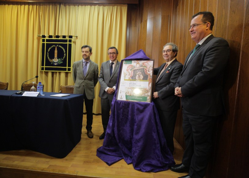 El presidente del Círculo Mercantil, Práxedes Sánchez, junto con el hermano mayor de la Macarena, José Antonio Fernández Cabrero y el comisario de la exposición, Joaquín Rodríguez Mateos que es, a su vez, director de los trabajos de ordenación y clasificación del archivo general de la hermandad, fueron los encargados de descubrir el cartel de la XIV edición de Círculo de Pasión 2020, en el cual se representa la página del libro de reglas original de la entidad de 1595, donde aparece el Señor de la Sentencia con túnica púrpura, desaparecida y que fue recuperada hace quince años.