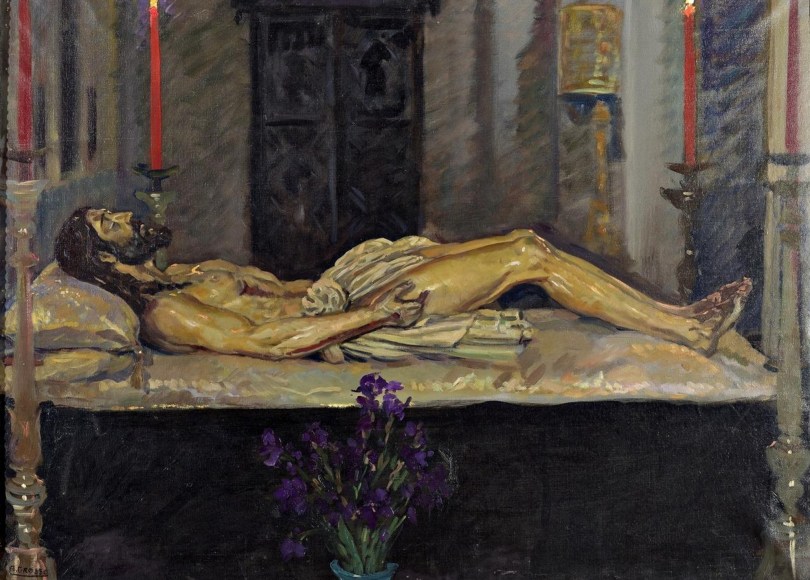 En esta obra se representa al Cristo Yacente, titular de la corporación del Sábado Santo, cuya imagen, tallada por el escultor cordobés Juan de Mesa, aparece expuesta a la veneración de los fieles en besapiés dispuesto en el interior de la iglesia de San Gregorio.