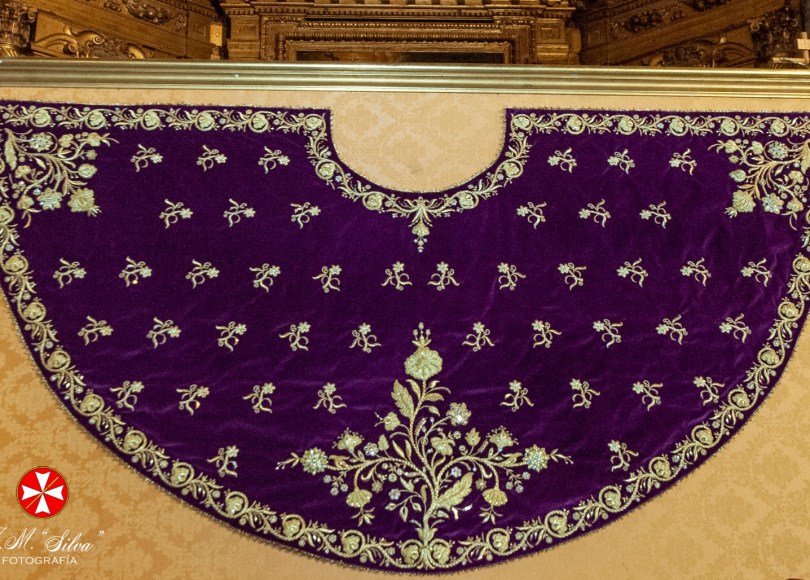 Ha sido bordada sobre terciopelo en color púrpura en el taller de Joaquín Salcedo Canca, bajo el diseño de Manuel Ballesteros Rodríguez. Está inspirado en los bordados del siglo XVIII y principios del XIX y basado en la antigua clámide denominada de ‘las florecillas’, actualmente desaparecida.