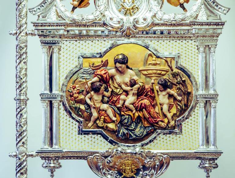 Sobre el remate de la vara, la escultura labrada en plata del ‘pelícano’, símbolo y representación de Cristo que derrama la propia sangre para la salvación del mundo, signo de la dedicación de los padres hacia los hijos. Aparece sobre la cúpula invertida de la torre de la Parroquia.