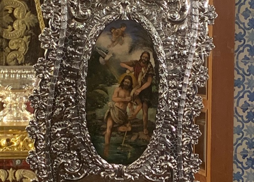 En su parte central lleva otro óvalo mayor con una pintura central del Bautismo del Señor por San Juan Bautista. Estará rematado por la tiara papal representativa del carácter basilical de San Juan de Letrán de Roma a la que la hermandad se encuentra agregada.