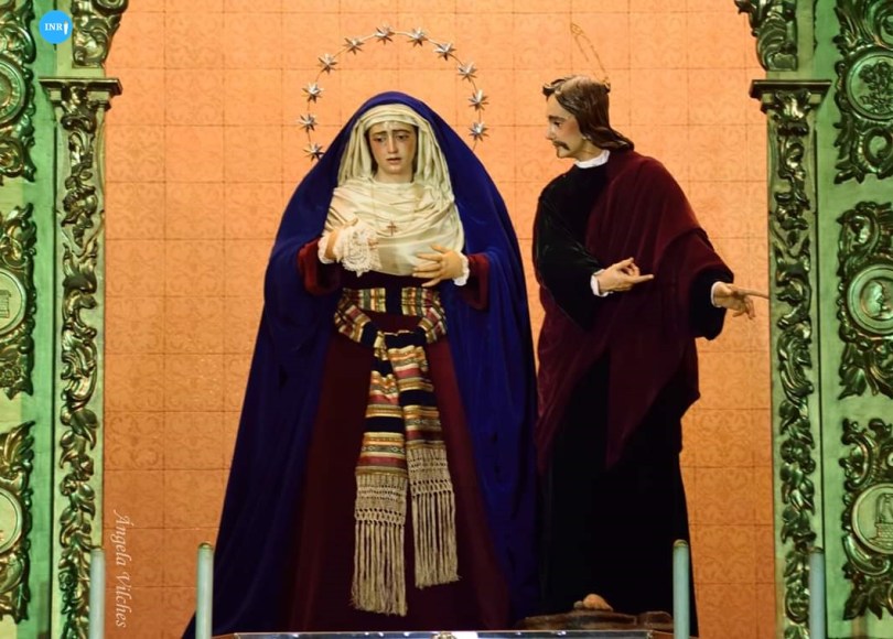 Tal y como se puede apreciar, la imagen luce su manto azul de raso, saya en terciopelo burdeos, una aureola de estrellas y su fajín hebraico. Le acompaña en su camarín San Juan Evangelista con su habitual túnica verde y mantolín burdeos de terciopelo.