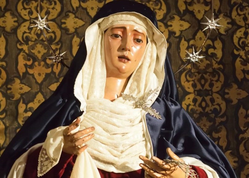 La dolorosa presidió su misa de este Viernes de Dolores, ataviada de esta forma, y que retransmitida vía streaming a través de las redes sociales.