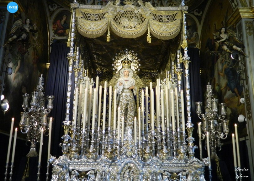 Se puede contemplar a la imagen con su manto azul bordado de camarín y saya blanca para la ocasión, además de su presea enriquecida para esta coronación. A diferencia de como lo hace el Jueves Santo, se puede ver a los lados del paso los candelabros de cola.