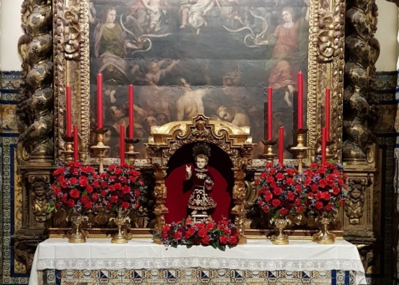 El retablo está realizado por Fernando de Barahona en 1677. Presenta además columnas salomçonicas que enmarca la pintura de las Ánimas y que recuerda un antiguo culto muy arraigado en la capital hispalense.