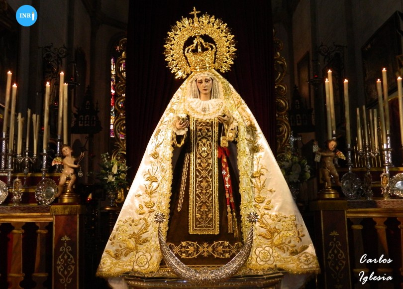 La dolorosa de la corporación de Omnium Sanctorum lució su manto blanco de vistas y saya con escapulario marrón en su peana y media luna a sus pies. Tras la talla un dosel y a los lados, dos pequeños altares con candeleros de velas blancas, algunas piezas de orfebrería y jarras con flores blacas de distintas especies.