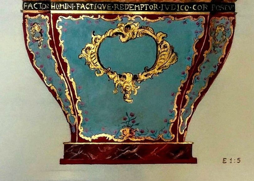 De planta octogonal, la pieza engloba las labores de talla ornamental, dorado y pintura artística, y se plantea para ser vista a tres caras. En cada una de estas tres caras, además de la traseram , con gran vistosidad cromática, se combina la rocalla periférica con la presencia de una gran cartela tallada en la que se desarrolla el programa iconográfico pictórico.