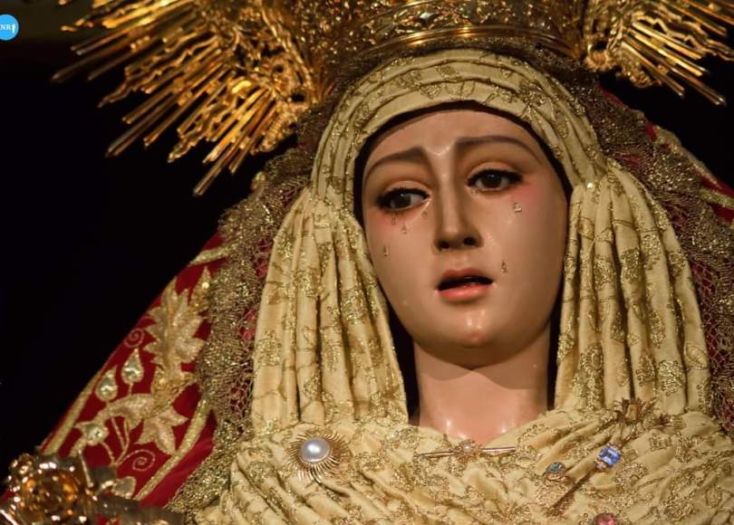 En su nuevo dosel, la dolorosa de Luis Álvarez Duarte lució manto rojo de vistas, saya blanca, y fajín multicolor, predominando el blanco. Flores blancas y candeleros con cera del mismo color se pudo ver en el montaje por parte del equipo de priostía.