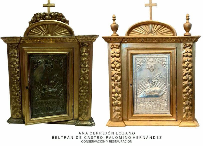 Es el caso de la Hermandad de Monte-Sión. La corporación del Jueves Santo ha concluido la restauración de uno de sus sagrarios, que habitualmente está en la sacristía de su capilla. Estos trabajos han sido realizados por Ana Cerrejón Lozano y Beltrán de Castro-Palomino Hernández.