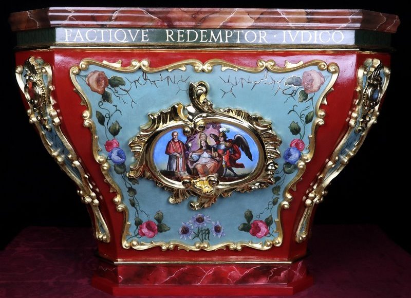De planta octogonal, la pieza engloba las labores de talla ornamental, dorado y pintura artística, y se plantea para ser vista a tres caras. En cada una de estas tres caras, además de la trasera y con gran vistosidad cromática, se combina la rocalla periférica con la presencia de una gran cartela tallada en la que se desarrolla el programa iconográfico pictórico.