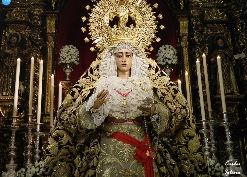La dolorosa iba vestida con su manto en terciopelo morado y saya de salida, ambas piezas bordadas por Esperanza Elena Caro, además de un fajín rojo. Tras la imagen se pudo ver el sillón de la realeza de María en su camarín, además de varios candeleros de cera blanca y flores de la misma tonalidad.