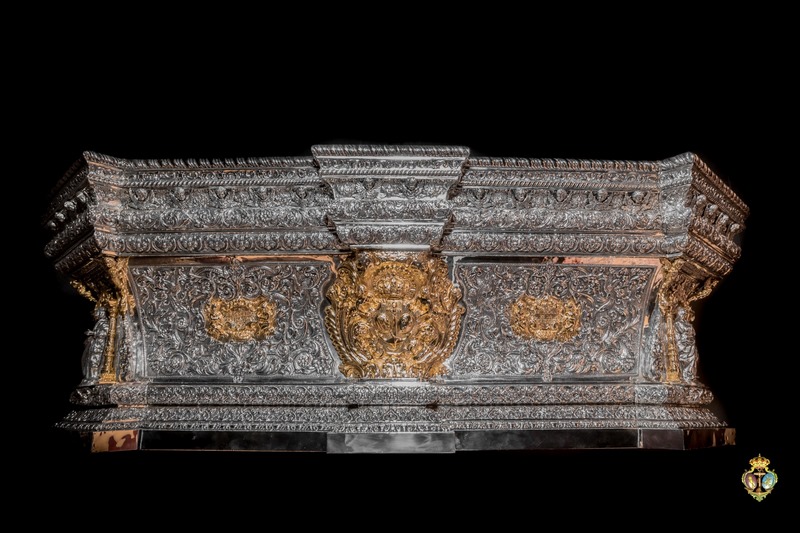 Estos detalles, que resaltan sobre la plata en su color original, generan que la peana vaya a juego, en ese sentido, con los candelabros de cola en plata, al mostrar también algunas partes sobredoradas.