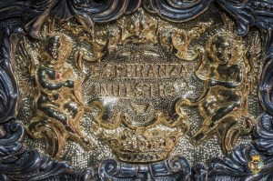 Posee una ornamentación muy menuda y muestra en el centro de su parte frontal, sobredorado, el antiguo escudo corporativo, aún vigente en aquellas fechas. Igualmente, posee otras cartelas también sobredoradas con las leyendas ‘Esperanza Nuestra’ y ‘Estrella de la mañana’ en el frente y ‘Refugio de los pecadores’ y ‘Puerta del cielo’ en los laterales. Sigue el estilo neorrenacentista de la orfebrería del paso de palio, y como recuerdo de la antigua presencia de San Juan Evangelista y de Santa María Magdalena acompañando a la Esperanza, ambos aparecen en las esquinas en una especie de hornacina enmarcada por elementos asimismo sobredorados.