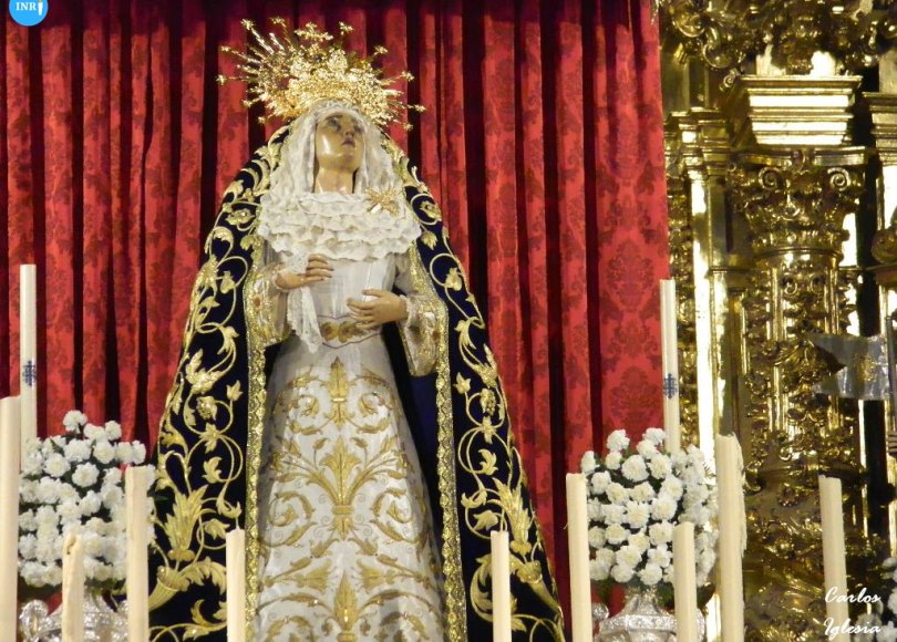 La dolorosa luce para la ocasión manto azul y saya blanca. Bajo dosel, se puede además contemplar varias tandas de candelería de cera blanca y flores de la misma tonalidad.
