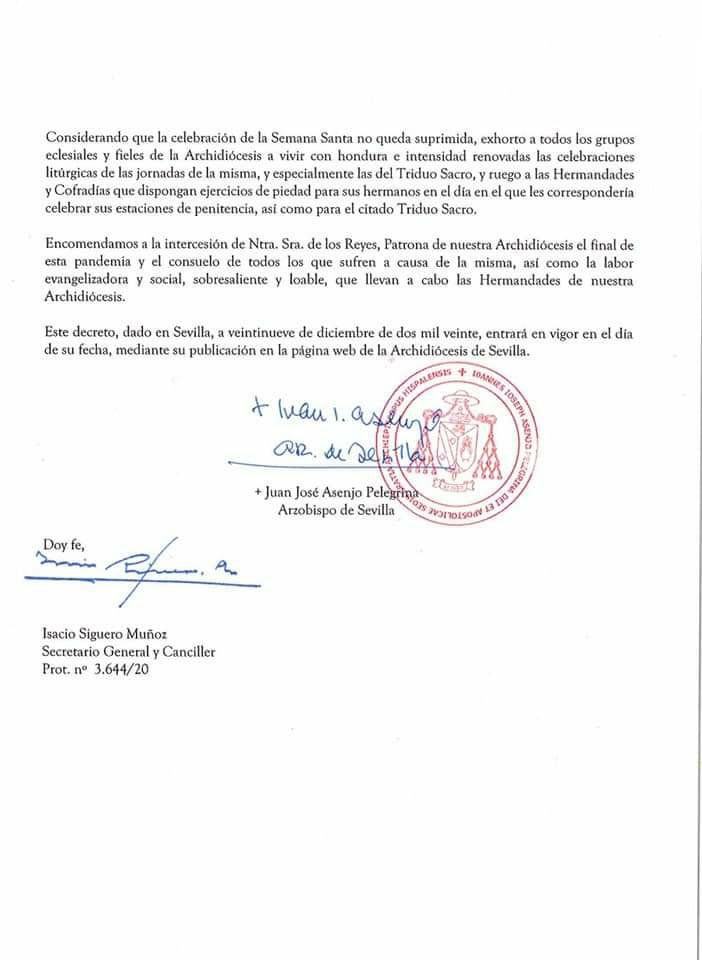 29 diciembre, 2020 Decreto de la suspensión de las procesiones de Semana Santa 2021 Publicado por Carlos Iglesia