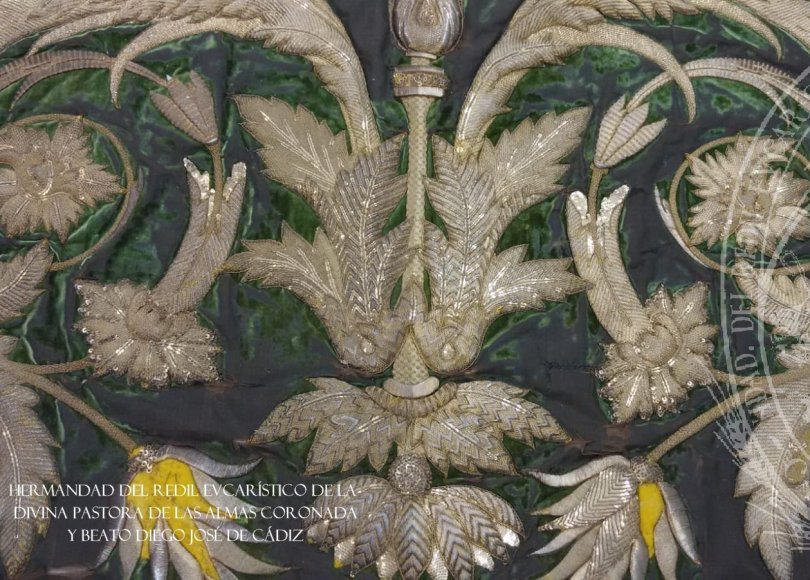Esta pieza, de autoría anónima, está datada del siglo XIX, fue un regalo de los duques de Montpensier. Presenta unos ricos bordados y con soporte de terciopelo verde.