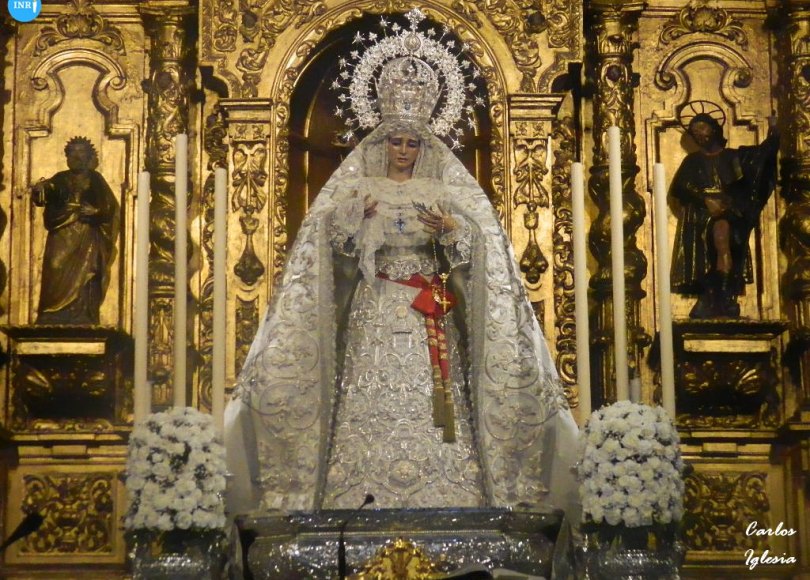 Sobre su peana se pudo ver a la Virgen de la Paz en el `presbiterio con su manto de vistas, realizado por el taller de Sobrinos de Elena Caro, saya a juego y su corona Fue realizada en los talleres de Juan Fernández, siguiendo el diseño de Joaquín Castilla junto a las modificaciones introducidas por Manuel Robles y enriquecida por los hermanos Delgado para su coronación canónica en 2016.