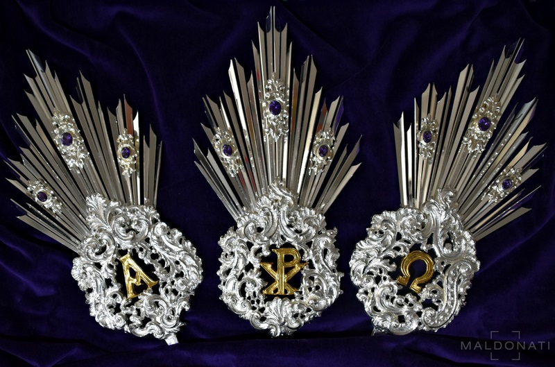Por otra parte, los veintiocho rayos están realizados de forma independiente con tres cartelas con amatistas, en referencia a la figura del nazareno.