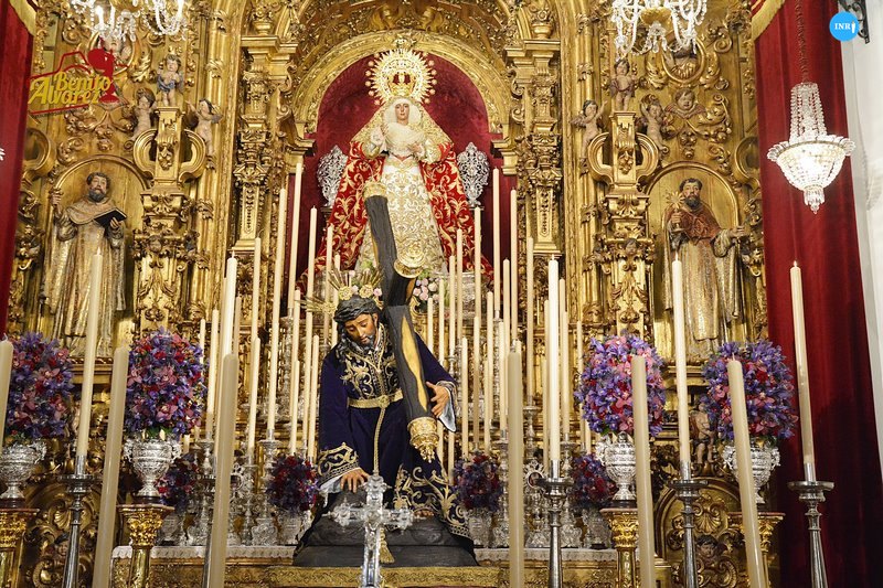 La imagen se encuentra sobre un pedestal decorado con un vetusto frente de altar del siglo XVlll realizado en un brocado de seda y oro. El nazareno luce las potencias que en oro y brillantes labró el taller de Orfebrería Villarreal en 1987, así como la túnica bordada sobre terciopelo morado realizada en el taller de Carrasquilla en 1978.