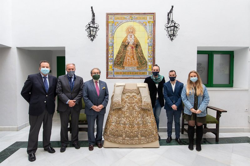 La saya conocida popularmente como ‘de las corbatas’ o ‘de los corbatines’ ha recuperado todo su esplendor original tras su restauración por la empresa especializada en la conservación y restauración de tejidos antiguos Cyrta. La Hermandad de la Macarena ha presentado esta pieza bordada en hilo de oro y sedas de colores sobre tejido de brocado de plata en el taller de Esperanza Elena Caro en 1965 con diseño de Fernando Marmolejo Camargo.