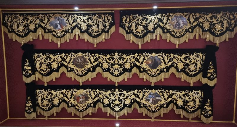 Están realizados en oro fino a realce sobre terciopelo verde noche. Cuenta con una gran variedad de tejidos, muchos recuperados y otros de nueva creación, destacando el juego de cartulinas que presentan diferentes texturas. El resultado es un bordado muy dinámico que muestra, cómo toque de personalidad, el uso de cristales de swarovski, que le otorgan a la obra un toque elegante y único.