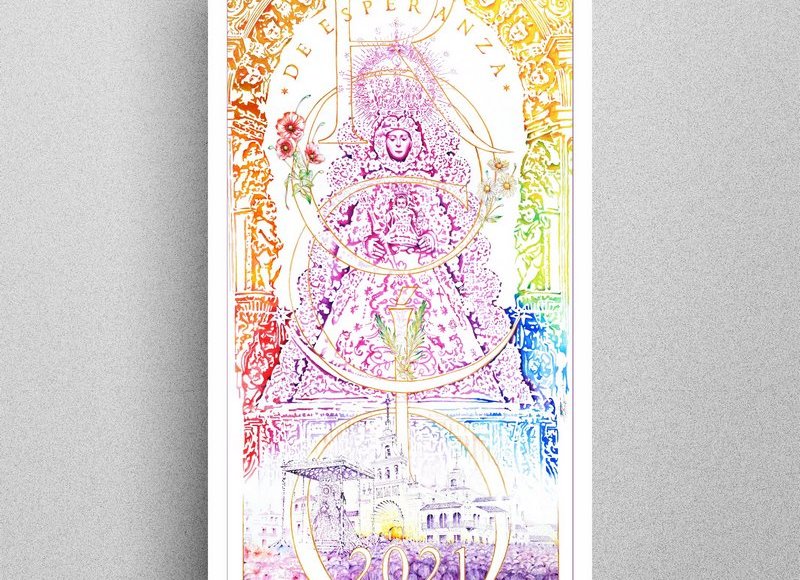 El camino no podía faltar en este cartel. “Está delante y a la vez detrás”, confiesa Peña, y es que las letras de ‘Rocío’ no son pintadas, son trazadas con los surcos que van dejando a su paso los simpecados, en su largo caminar. Sobre los trazos de Su nombre, aparecen un puñado de amapolas, margaritas y romero, flores que, año tras año, perfuman ese camino de color y aroma.