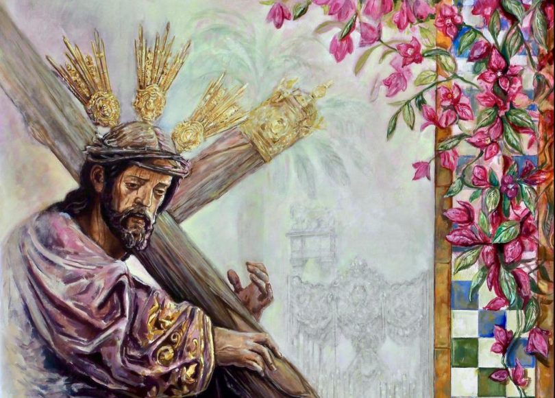 El logotipo del centenario está insertado a modo de azulejo donde está perfectamente representada la frase que define a esta hermandad y que se ha intentado trasladar como mensaje principal del cartel: ‘Salud’, en la imagen portentosa del nazareno que nos mira desde la pintura y que tanto necesitamos, y ‘Luz’, en honor a la dolorosa en el palio encendido, en la luz del cielo y en la alegría cromática que he intentado transmitir en esta obra.