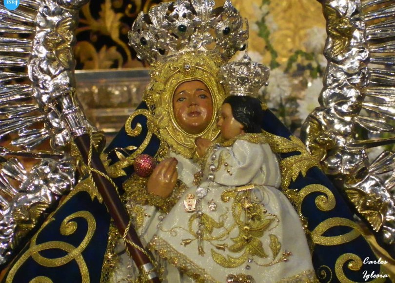 Sobre su peana, la talla vestía para la ocasión su manto de salida de color azul marino bordado y saya blanca a juego, con ráfaga y media luna. El exorno floral estuvo compuesto por flores en tonalidad naranja y amarilla. De igual modo, también estaba expuesto su simpecado.