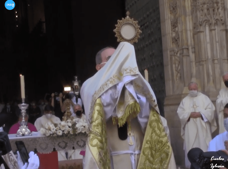 Por otro lado, el Santísimo Sacramento fue portado por Asenjo sin usar la custodia de Arfe ni la compañía de los pasos de los santos sevillanos. Poco después alcanzó la puerta de la Asunción del seo hispalense que permanecía abierta para la ocasión. Decenas de personas y medios de comunicación se agolpaban en las inmediaciones para captar lo que estaba por ocurrir.