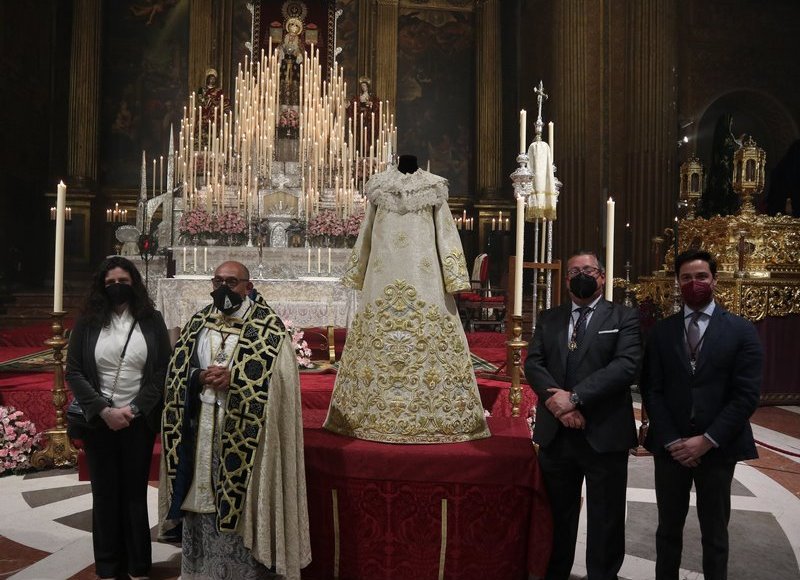 La saya se ha ejecutado en hilos de oro fino, plata y seda de colores, siendo el soporte un tisú de elaboración manual en hilos de plata de tonalidad marfil, evocando la letanía ‘Turris Ebúrnea’ de las lauretanas del Santo Rosario.