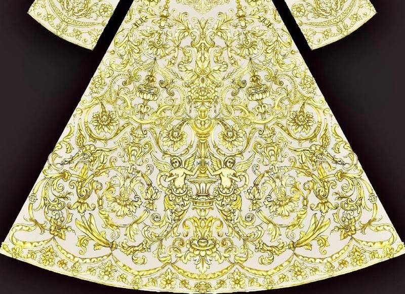 Bajo el nombre de la saya ‘de los querubuines’ ha sido diseñada por Álvaro Abril y que ejecutará Dolores Fernández Martos. Tiene la particularidad de que este dibujo está basado en las antiguas bambalinas del paso de la imagen, que diseñara José Recio y realizara en el taller de Olmo en 1918, y que en la actualidad se encuentra en Ceuta.