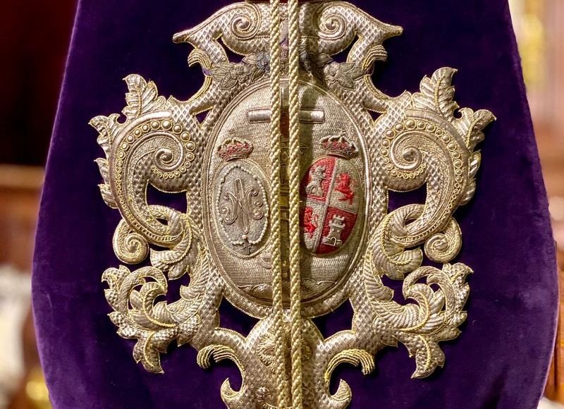 Estas tareas han consistido en la limpieza exhaustiva, tanto del soporte textil como del maravilloso escudo que ejecutara el taller de Carrasquilla y que fue bordado en 1953, ya que se encontraba ennegrecido y con manchas de cera ocasionadas durante las diferentes estaciones de penitencia y cultos de la entidad.