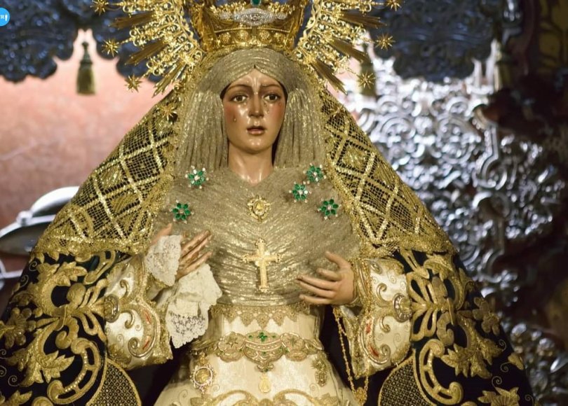 Para la ocasión, la dolorosa luce el manto ‘Esperanza Nuestra’, confeccionado en 1962 en el taller de Carrasquilla reutilizando piezas del palio rojo de Rodríguez Ojeda de 1908 y del de Victoria Caro de 1942.