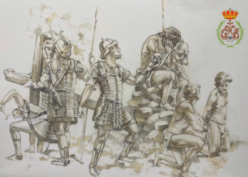 Por último, cierra esta escena un sayón que se encarga con un berbiquí o taladro casero de la época, de abrir los agujeros en la cruz para la crucifixión del Señor. Este sayón pone su mano derecha en las vestiduras del Señor a modo de desprecio, sirviéndole de apoyo para ejercer la fuerza de su mano derecha y el peso de su cuerpo.