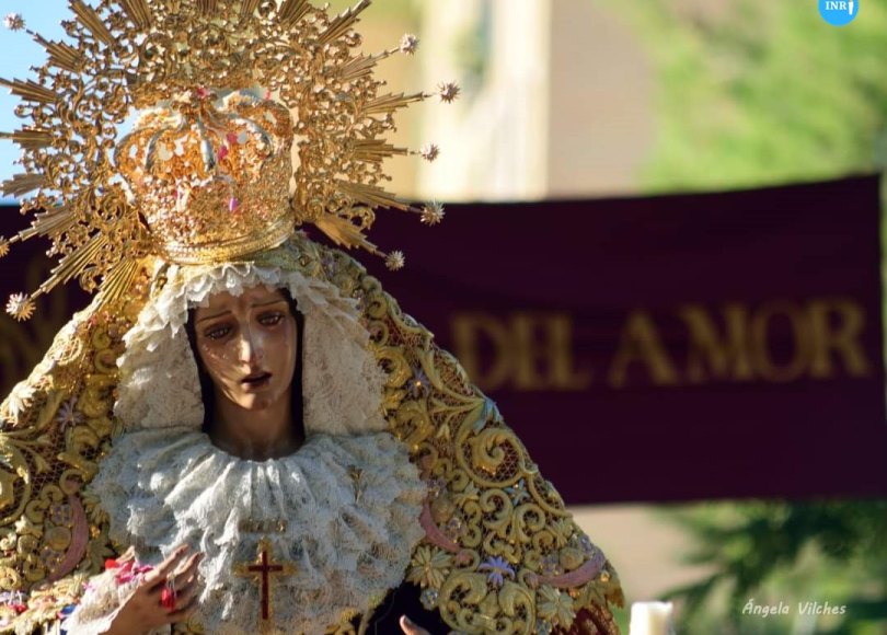 Otra de las imágenes que estuvieron expuestas para este culto fue la Virgen del Amor de la Hermandad de Pino Montano. Al igual que en el rosario, lució su manto rojo de brocado y saya de terciopelo azul.